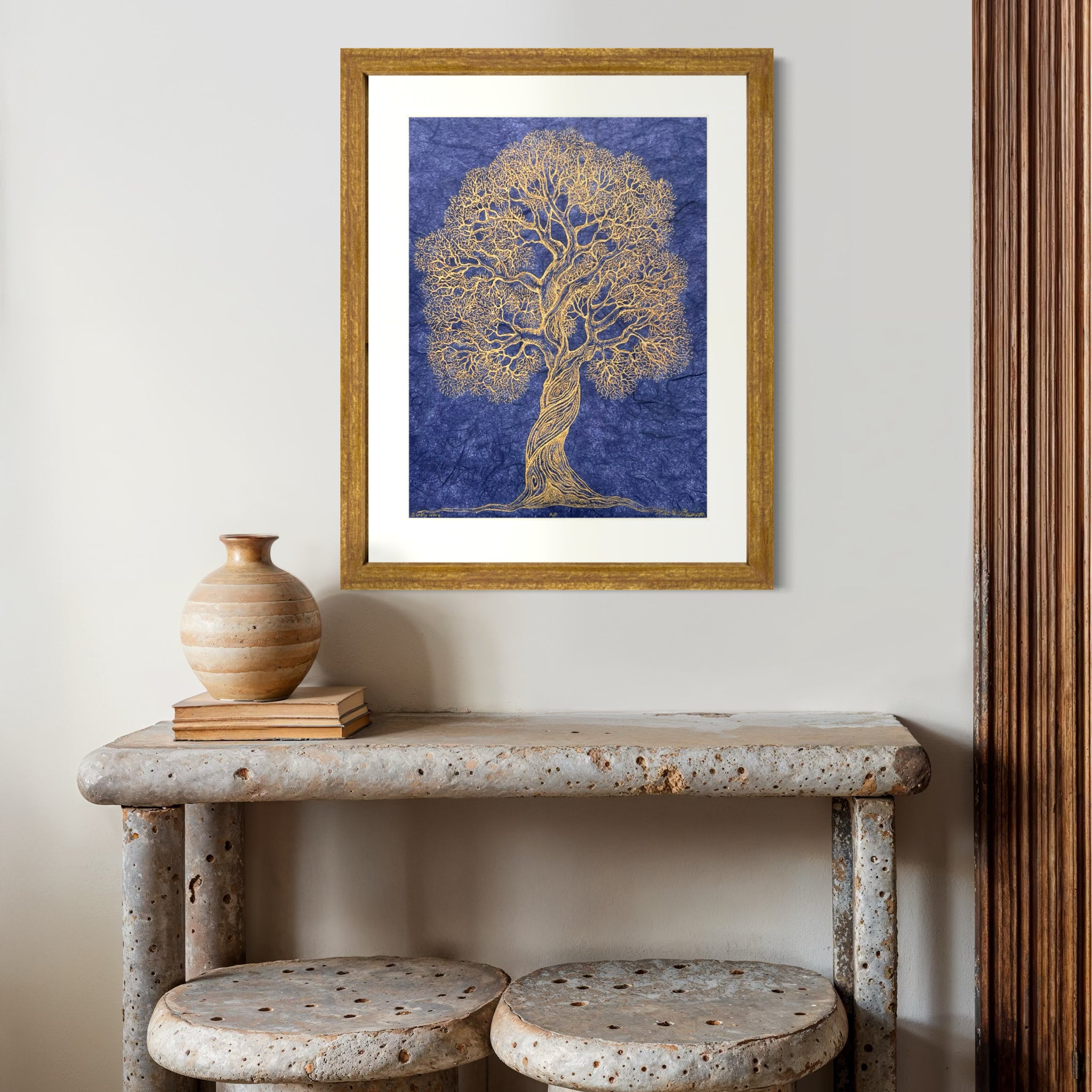 Discover ”Simply Here”, a captivating chine-collé print featuring a delicate gold ink tree, illuminated by shimmering gold mica powder. This grounding piece blends traditional printmaking with luminous metallics, creating a sense of serenity and timeless beauty. Perfect for those who appreciate elegant minimalism and the organic interplay of light and texture.