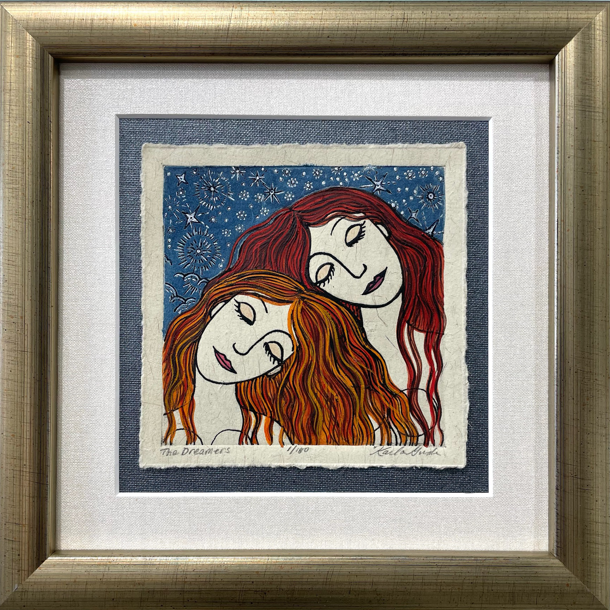 “The Dreamers” celebrates connection, imagination, and the quiet strength found in shared vision. Beneath a star-filled sky, two figures rest side by side — calm, thoughtful, and open to what’s ahead. Their mirrored posture creates a sense of unity while the deep blue celestial background adds depth and movement.